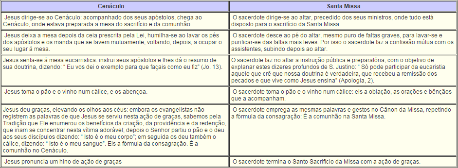 "A Santa Missa é o sacrifício do Corpo e do Sangue de Jesus Cristo, oferecido sobre os nossos altares, debaixo das espécies de pão e de vinho, em memória do sacrifício da Cruz".